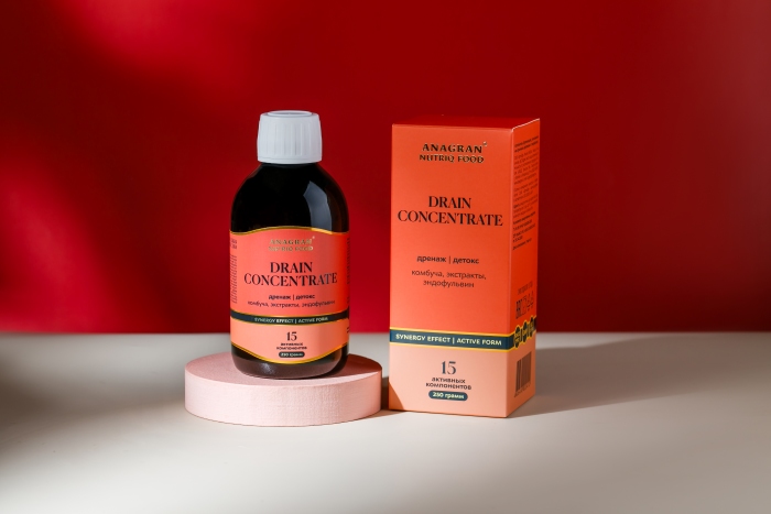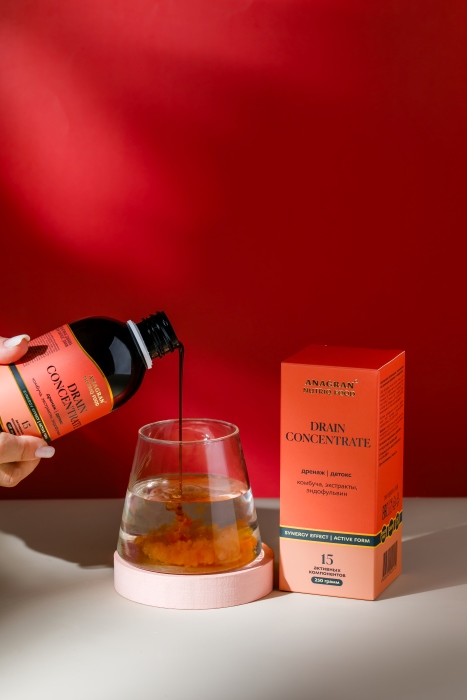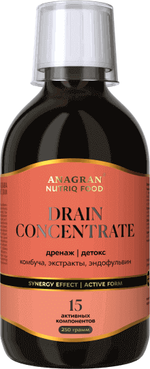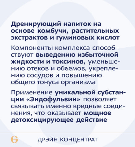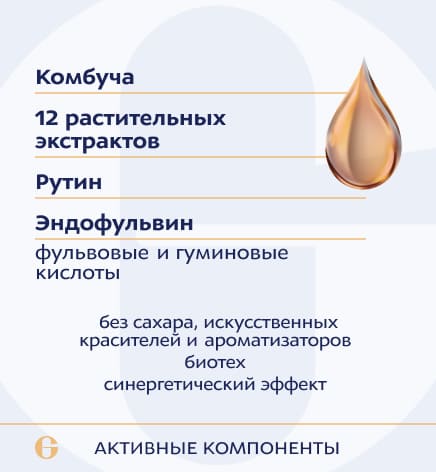 концентрат метаболитов симбиотической культуры грибка Zygosaccharomyces bisporus и бактерий Acetobacter aceti, Gluconacetobacter xylinus, Gluconacetobacter hansenii (Комбуча), кукурузных рылец экстракт, лопуха корня экстракт, артишока листа экстракт, каштана конского семян экстракт, малины листа экстракт, смородины черной листа экстракт, брусники листа экстракт, толокнянки листа экстракт, солодки корня экстракт, зеленого чая экстракт, ортосифона листьев экстракт, хвоща травы экстракт, рутин, комплексная пищевая добавка «Комплекс «Эндофульвин (Endofulvin)». Вспомогательные вещества: глицерин, вода очищенная, лимонная кислота (регулятор кислотности), ароматизатор натуральный «Малина».
