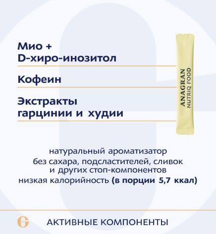 кофе растворимый, инозитол (мио-инозитол), ароматизаторы натуральные «Карамель», «Кофе», гарцинии экстракт, худии экстракт, кремния диоксид (антислеживатель), D-хиро-инозитол.