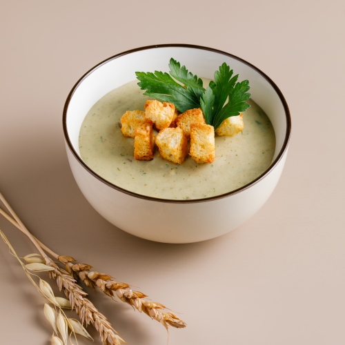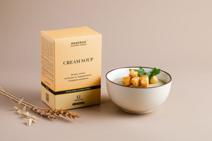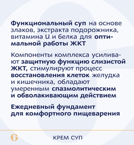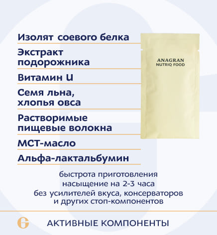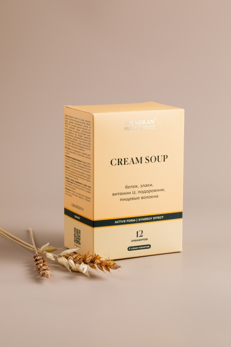 хлопья картофельные, изолированный соевый протеин, МСТ масло порошок (среднецепочечные триглицериды), льняная мука, лен (семя), альбутин альфа (сывороточного альфа- лактальбумина гидролизат), овсяные хлопья резаные, ксантановая камедь, гуаровая камедь, метилметионинсульфония хлорид, подорожника листа экстракт, витамин С (аскорбиновая кислота), витамин А (ретинола ацетат), витамин В1 (тиамина мононитрат). Вспомогательные вещества: бульон овощной, сливки растительные, петрушка листья, укроп листья, кремния диоксид (агент антислеживающий), лавровый лист.