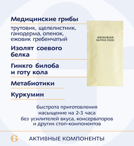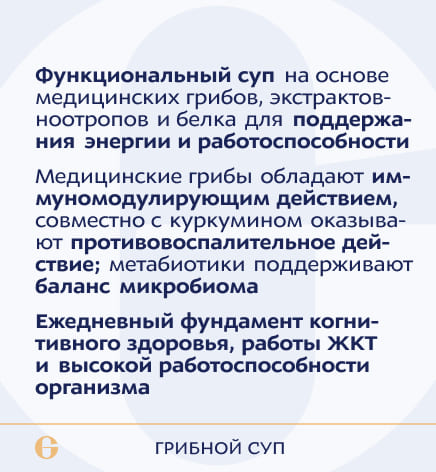 изолированный соевый протеин, трутовик разноцветный гриб сухой в порошке ARTM-16, щелелистник обыкновенный гриб сухой в порошке ARTM-26, ганодерма лакированная гриб сухой в порошке ARTM-1, ежовик гребенчатый гриб сухой ARTM-4, опенок зимний гриб сухой в порошке ARTM-18, Биомасса гидролизованная сухая «УЛЬТРАЛИЗАТ ПЕПТИДНЫЙ PR-Frd» P. freudenreichii ARTB-137, биомасса гидролизованная сухая «УЛЬТРАЛИЗАТ ПЕПТИДНЫЙ ST-Tr» Streptococcus thermophilus ARTB-188, гинкго билоба листа экстракт, куркумы экстракт, готу колы травы экстракт. Вспомогательные вещества: кукуруза воздушная, сливки растительные, бульон грибной, лук репчатый порошок, ароматизатор «Грибы», укроп листья, ксантановая камедь (загуститель), гуаровая камедь (загуститель), чеснок порошок, кремния диоксид (агент антислёживающий), сельдерей трава.